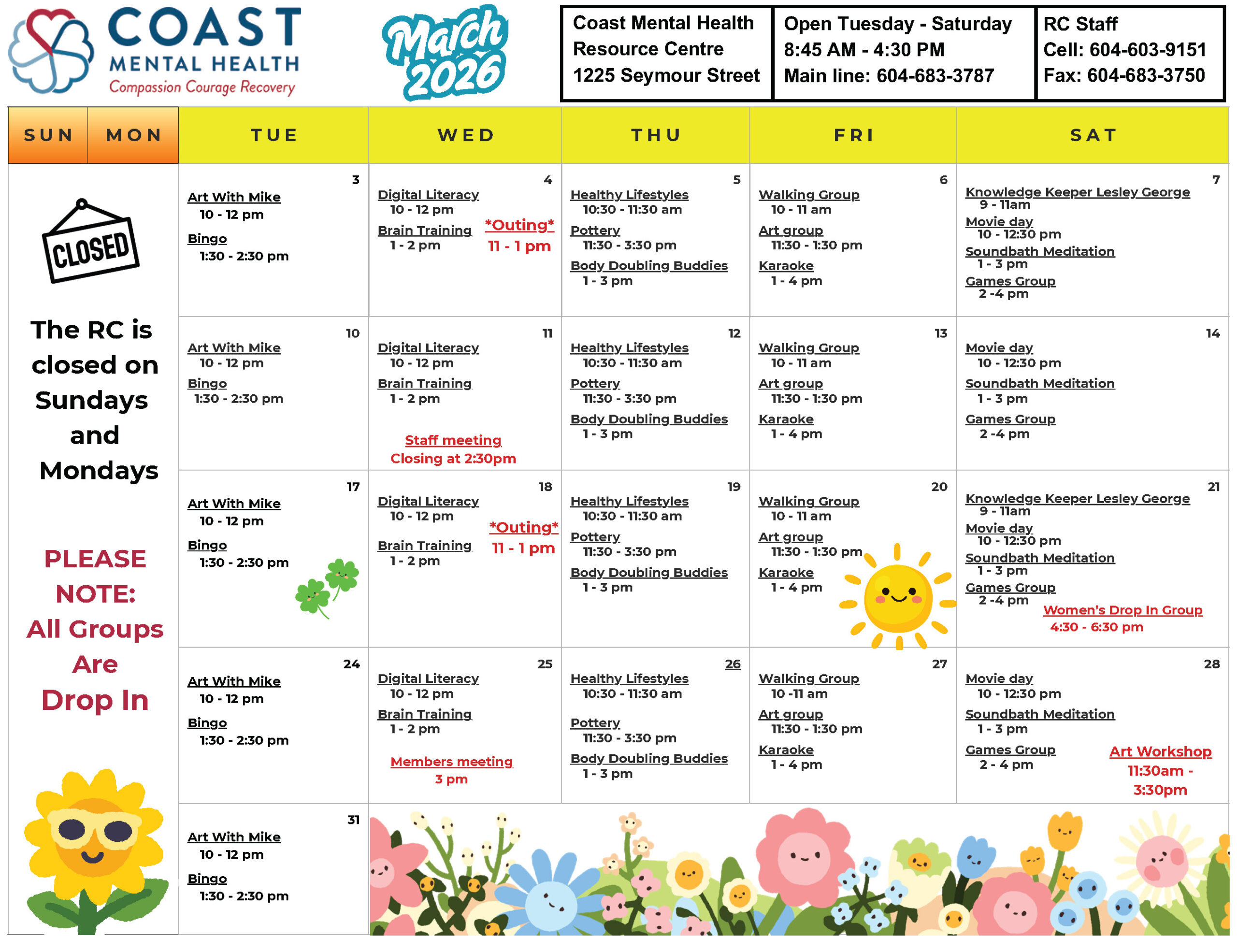 Review the calendar below to find out what activities are happening at the Resource Centre during March 2026. We offer daily programming, social activities, and a lunch service.