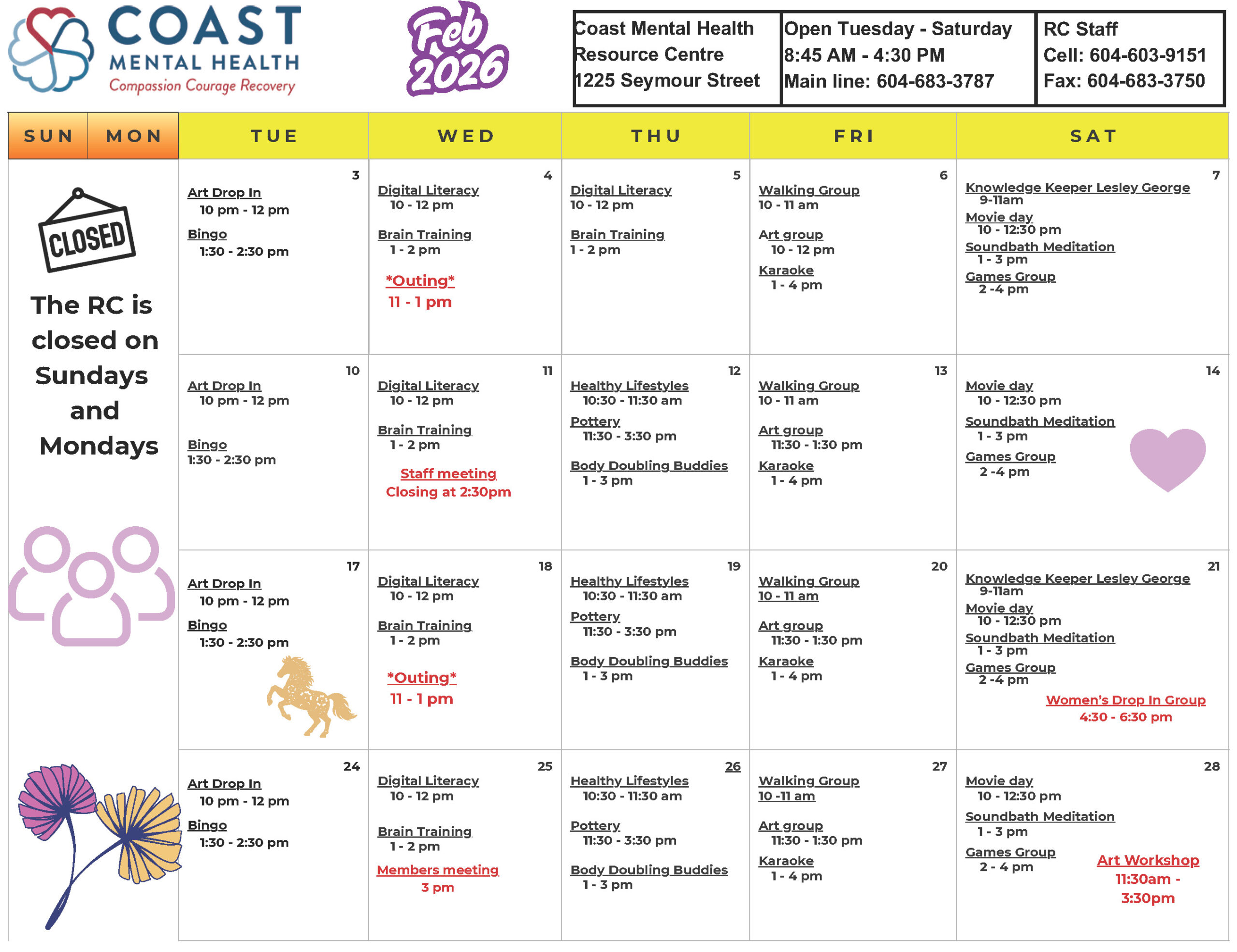 Review the calendar below to find out what activities are happening at the Resource Centre during February 2026. We offer daily programming, social activities, and a lunch service.