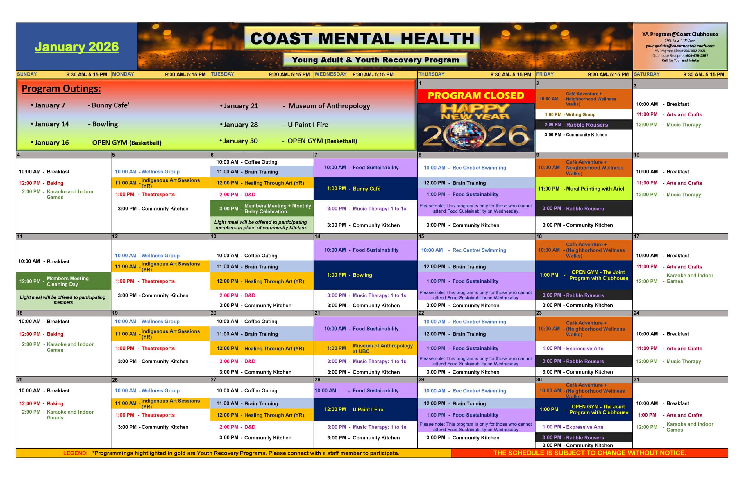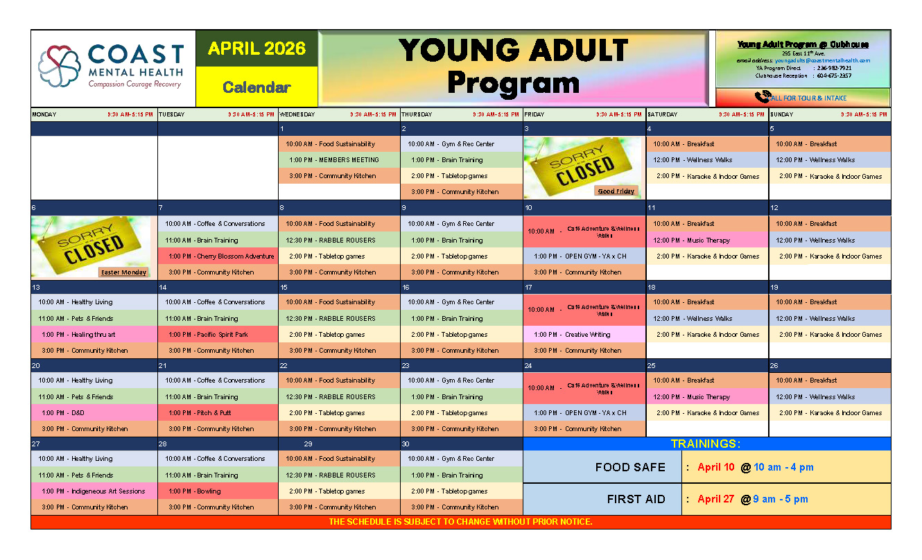For more information, referrals, or to schedule an intake, please contact the YA PROGRAM at Coast Mental Health Clubhouse.