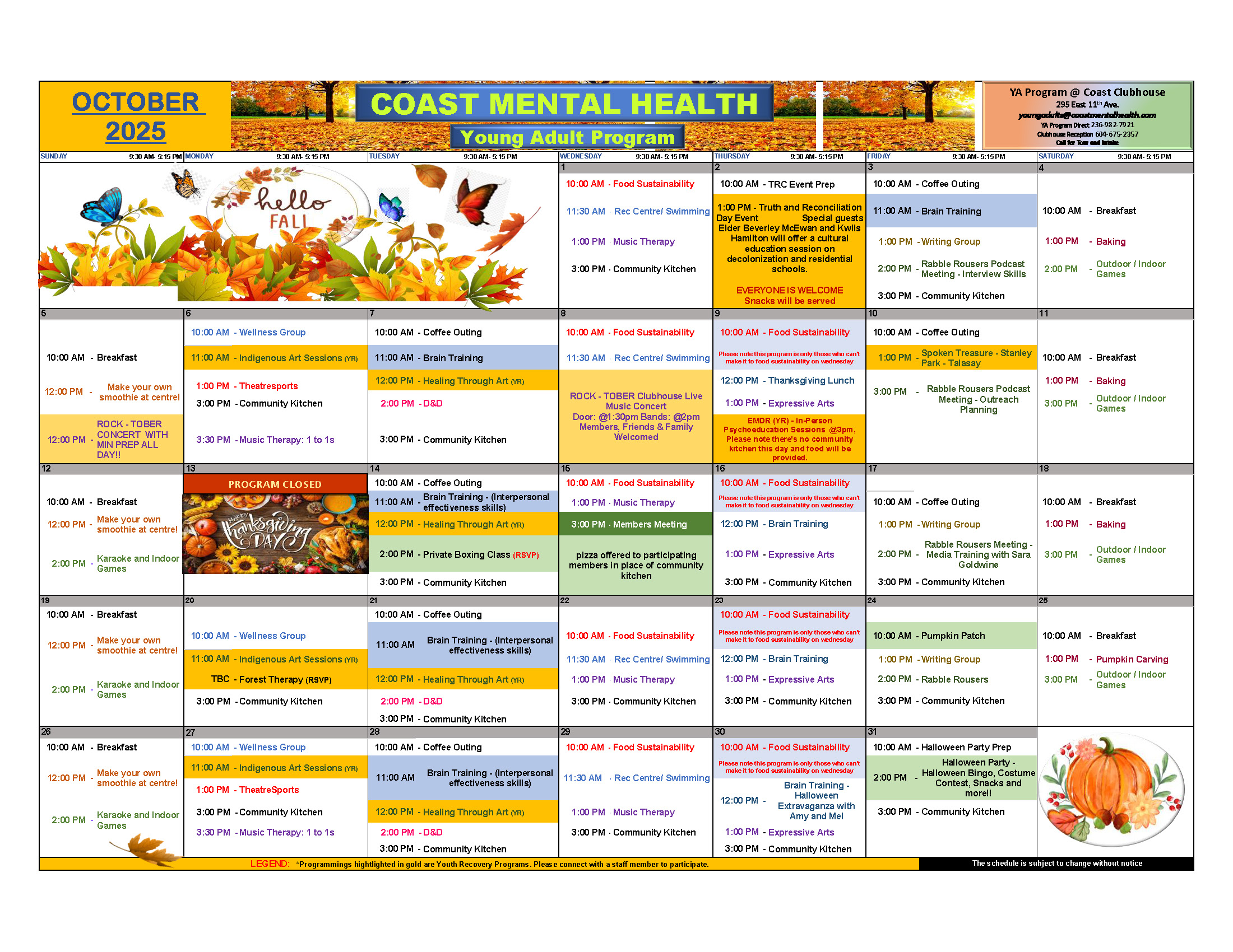For more information, referrals, or to schedule an intake, please contact the YA PROGRAM at Coast Mental Health Clubhouse.