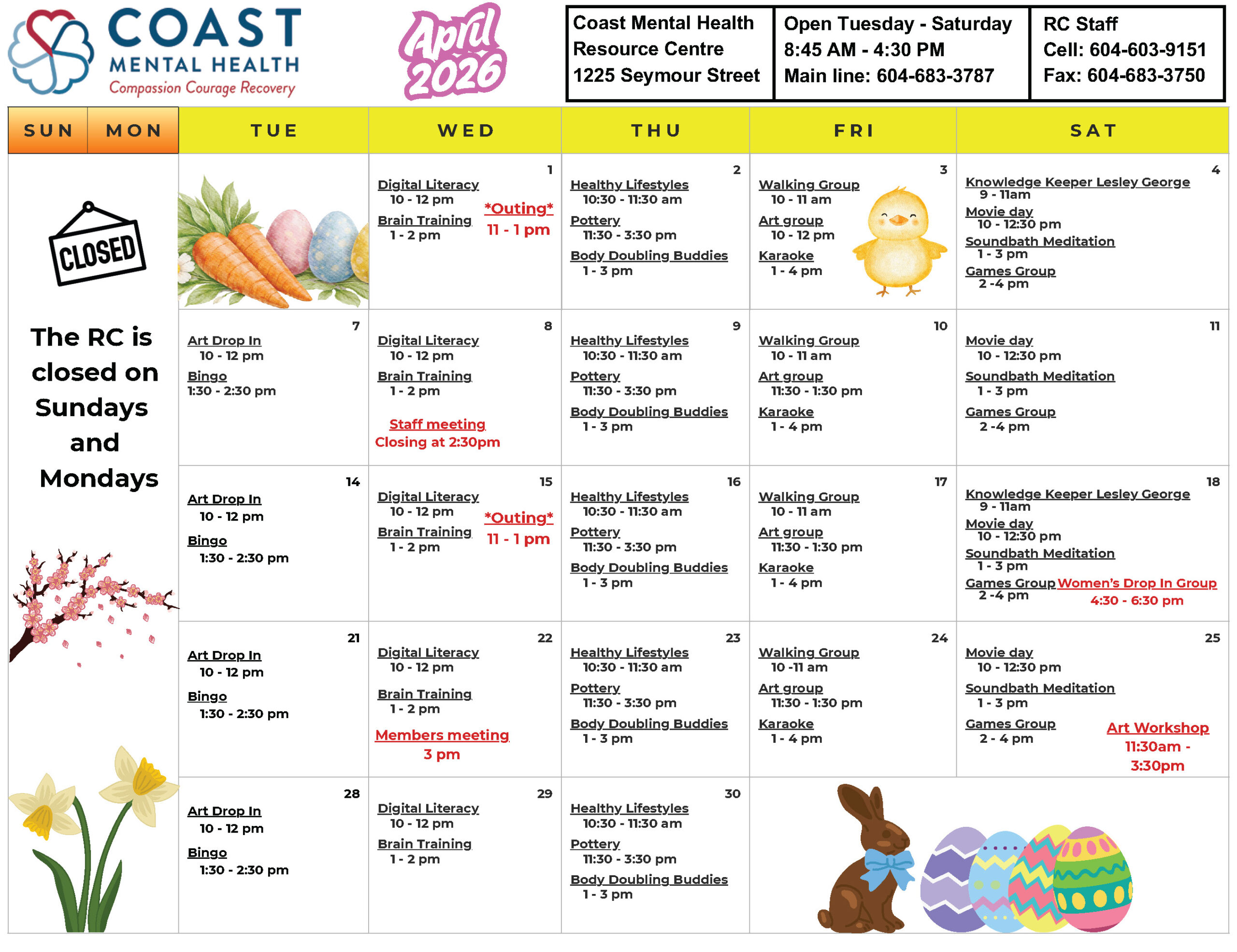 Review the calendar below to find out what activities are happening at the Resource Centre during March 2026. We offer daily programming, social activities, and a lunch service.